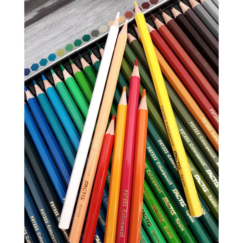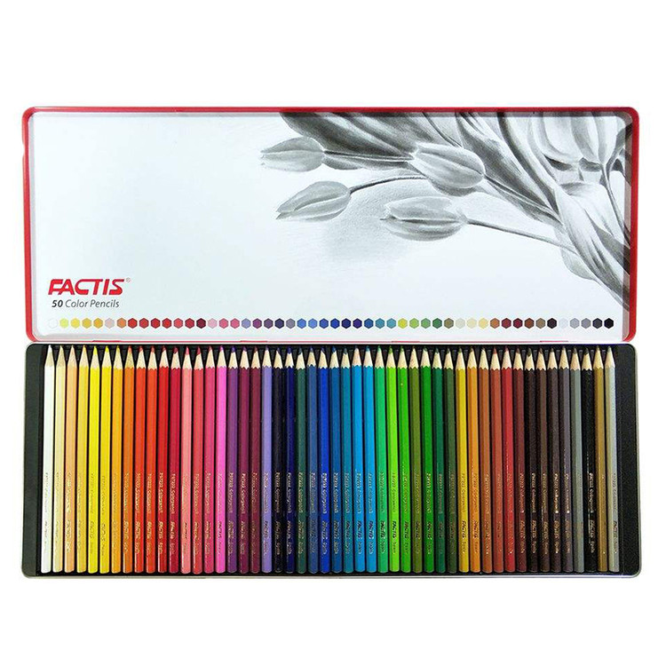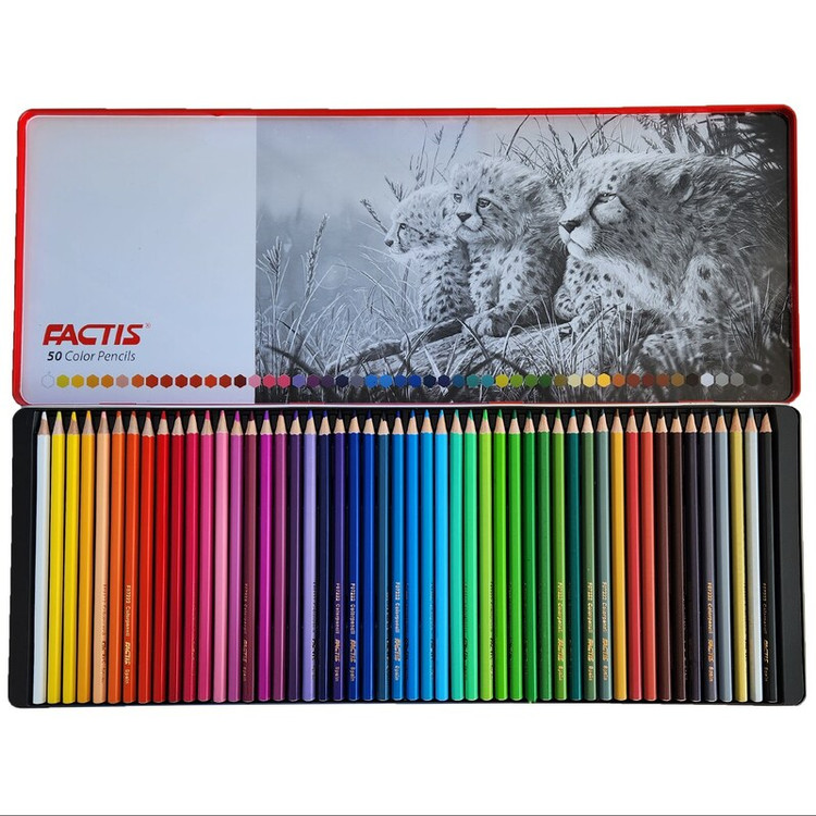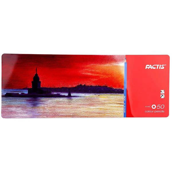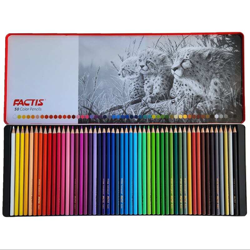 مداد رنگی فکتیس 50 با جعبه فلزی، شامل 50 عدد رنگ منحصر به فرد و زیبا است که یک هنرمند با خلاقیت، قوه تخیل و البته هنری که در دستانش است، قادر است تا از میان این 50 رنگ، میلیون ها رنگ را بیافریند و خالق نقاشی های هنرمندانه باشد.